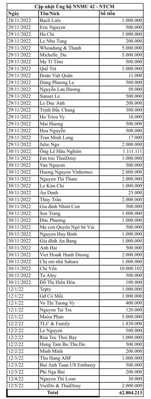 Cập nhật danh sách Quý MTQ đã ủng hộ NNMU 42 đến thời điểm hiện tại
