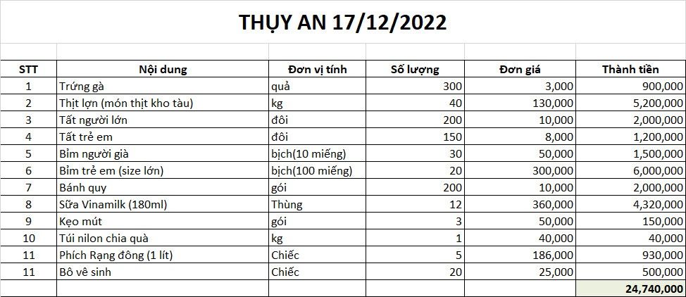 Năm nay Tết sắp cận kề, với mong muốn bữa cơm của họ có chút thịt và nhận được sự hỗ trợ của Chef Nguyễn Văn Khu cũng như các thành viên tình nguyện của trường Bách khoa, thời gian không còn nhiều nên nhóm quyết định ngày 17/12/2022 sẽ thực hiện một chương trình nho nhỏ. Với kinh phí khoảng 25 triệu đồng.