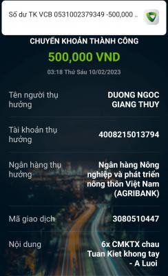 Em đã nhận được chuyển khoản từ chị Nguyên tổng cộng là 4 triệu bao gồm 3 triệu cho cho em Kiên, Thuý Trang, Thảo, Mai Loan, Minh Lân, Tuấn Kiệt, mỗi em 500k và 1 triệu cho bé Đoàn Minh Tuấn