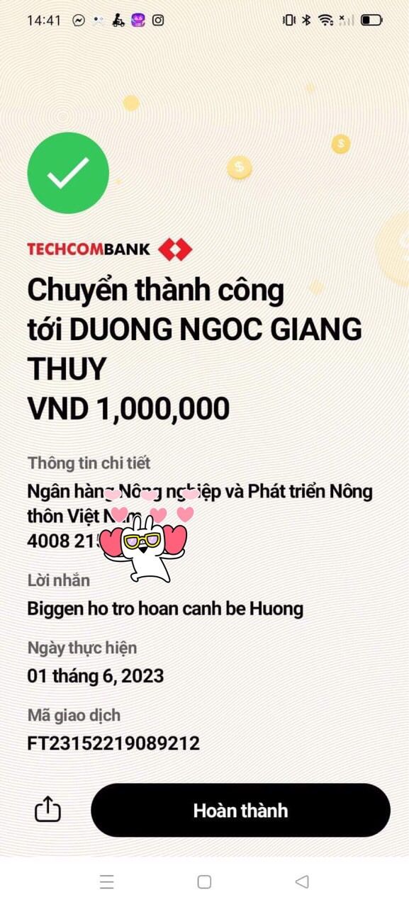 Loannguyen đã chuyển 500,000đ (400,000đ CMTX tháng 2 và 100,000đ lixi đầu năm) nhờ Wendy Dương chuyển cho bé Hương giúp nhé.