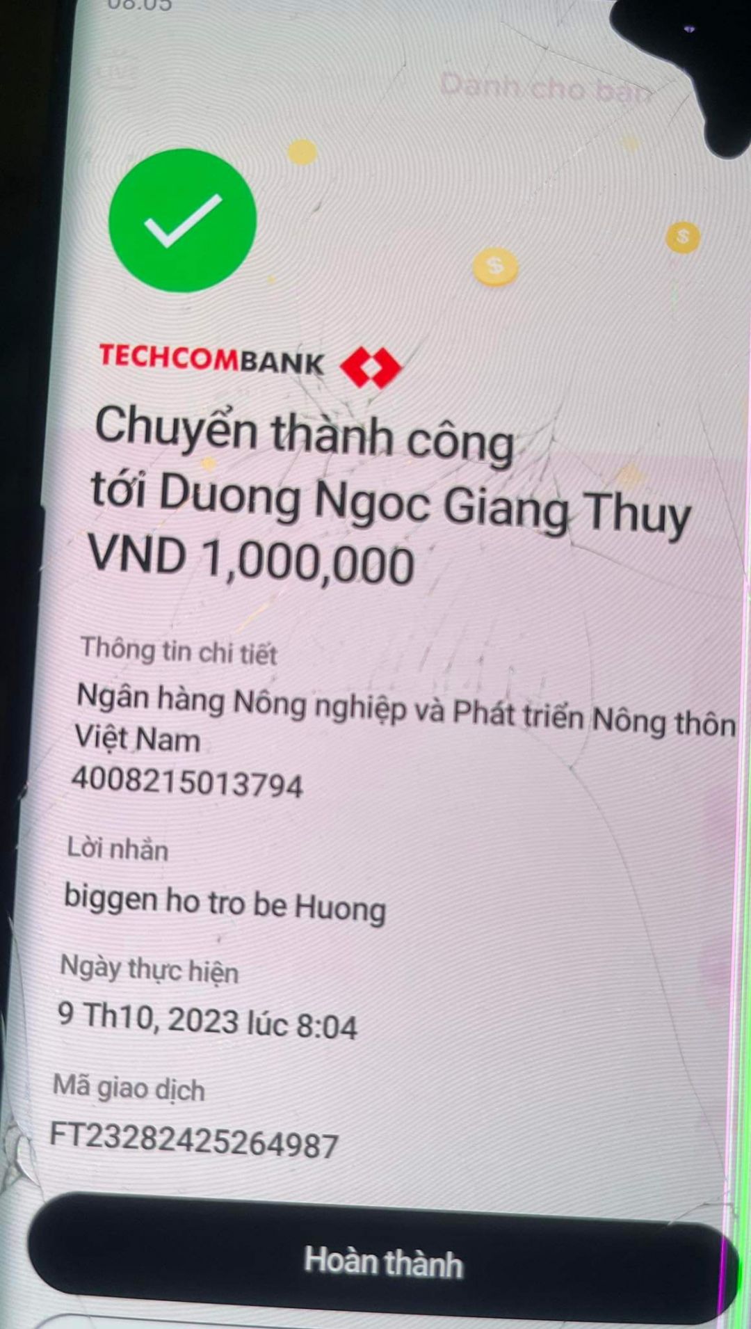 dạ em đã nhận được tiền và đã trao tận tay em Hương ạ!