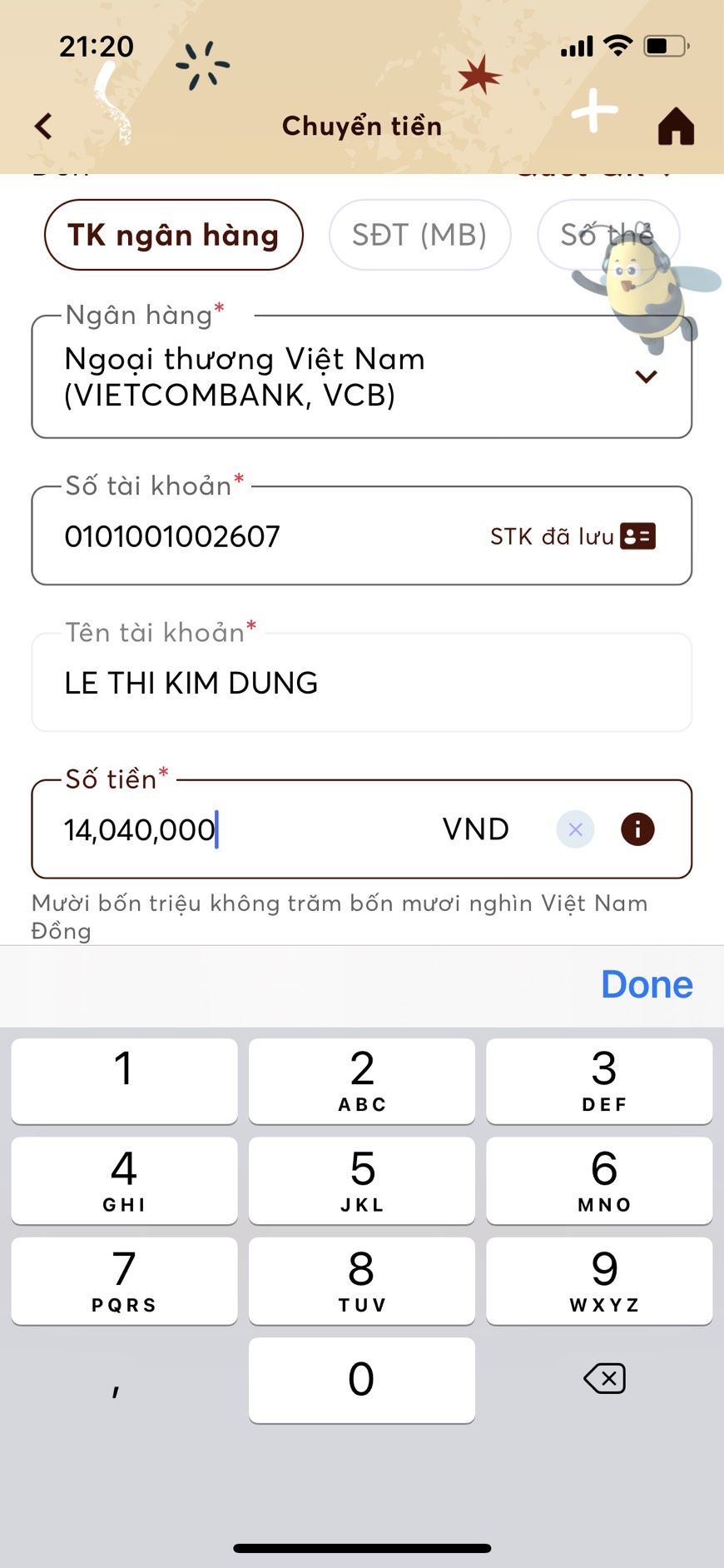 Dạ c Trang ơi chủ tài khoản là Lê Thị Kim Dung ạ. E viết thiếu chữ Thị ạ. E cảm ơn chị.