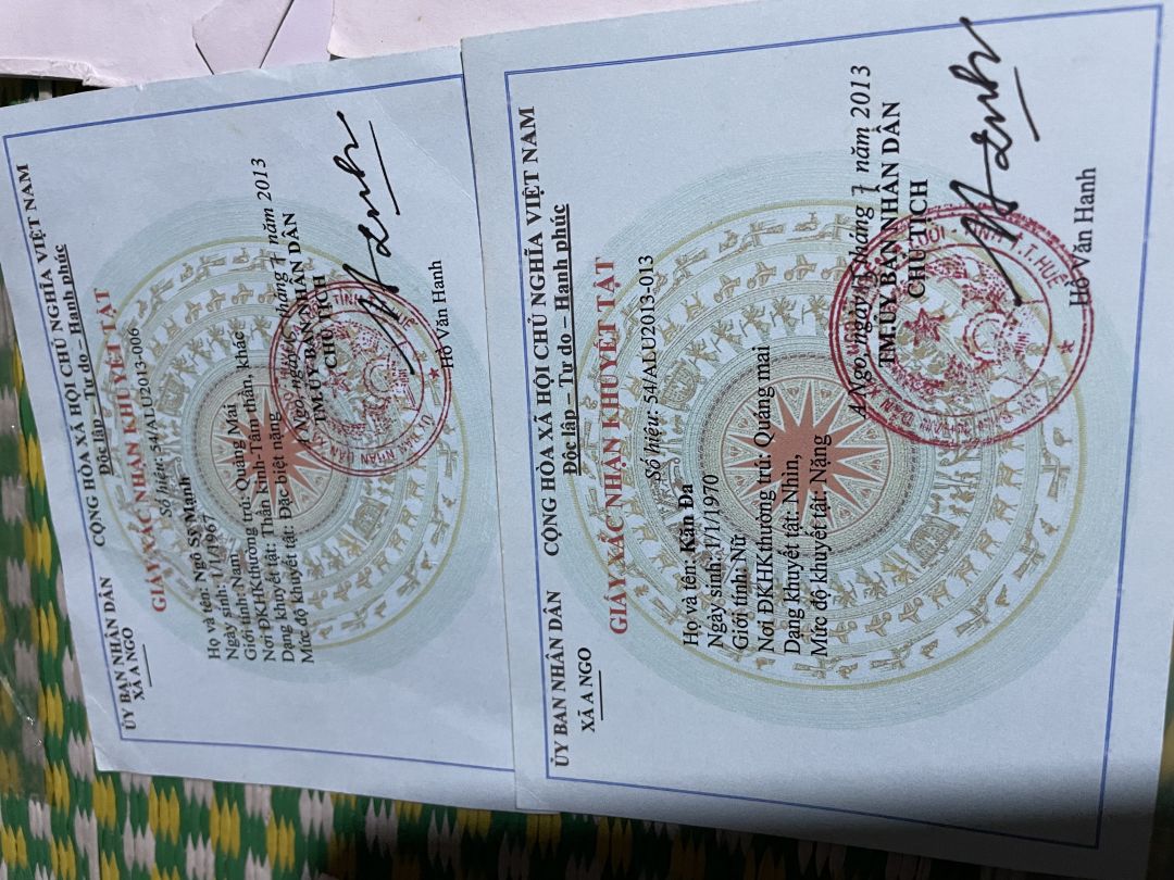 Hàng tháng ông Ngô sỹ  Mạnh được trợ cấp khuyết tật 720.000₫ , bà Nguyễn Thị Đa được trợ cấp khuyết tật 540.000₫