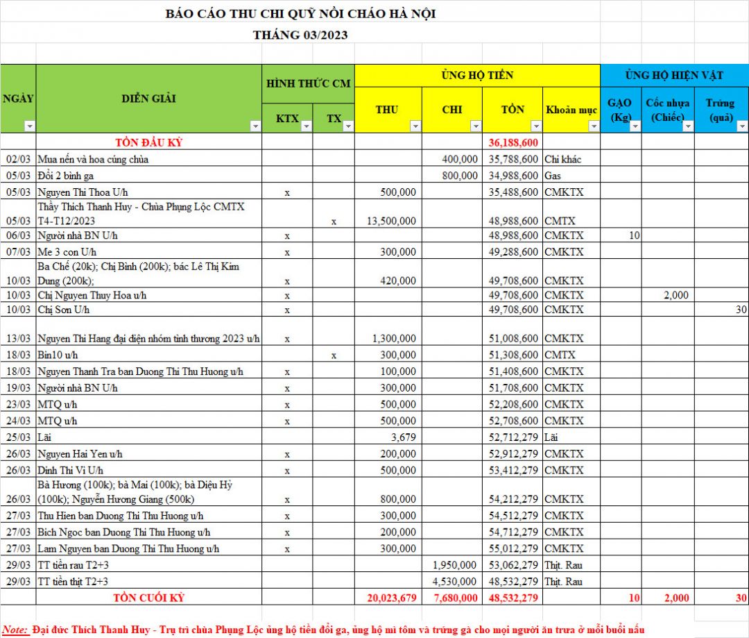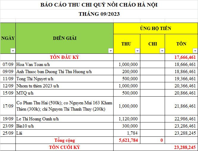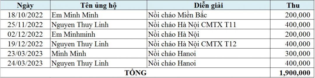 Từ tháng 09/2023 đến tháng 12/2023, tuy ngưng nấu nhưng Nồi Cháo Hà Nội vẫn nhận được rất nhiều sự ủng hộ của các MTQ.
