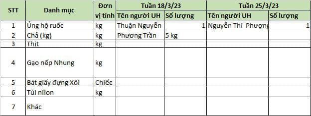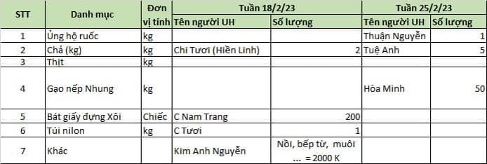 - Chị Tươi (bán giò chả) ủng hộ 2 kg chả + 01 kg túi nilon