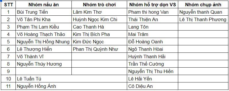 • Nhóm nấu ăn: chuẩn bị món cari gà chấm bánh mì cho tất cả mọi người ăn trưa