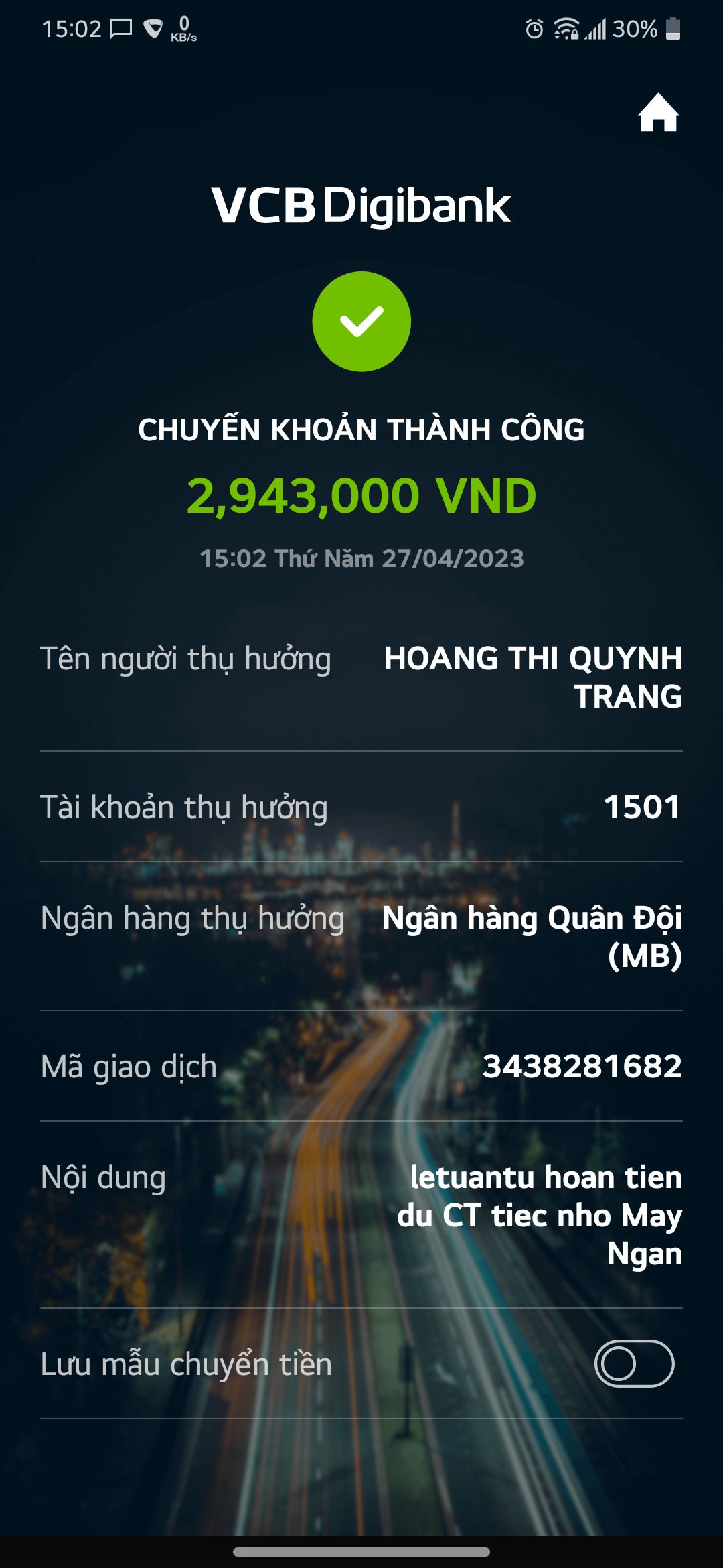 Letuantu đã chuyển phần tiền còn dư về tài khoản thủ quỹ.