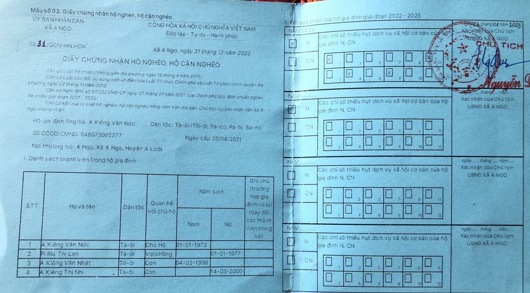 1. Ba: A Kiêng Văn Nức, 50 tuổi. Làm ruộng, không đi làm thêm nên không có thu nhập bằng tiền cụ thể