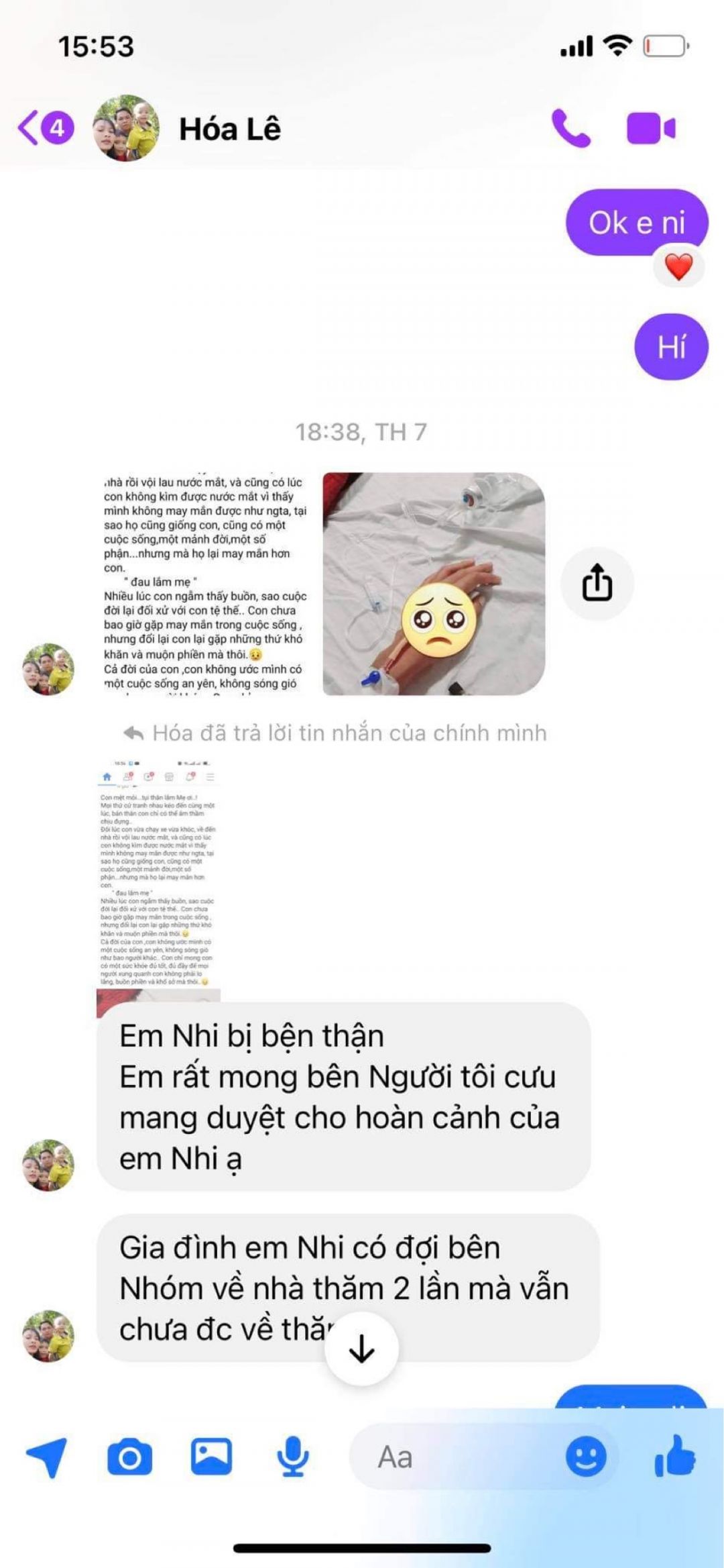 ,gia đình em Nhi cầu cứu nên cô Hoá