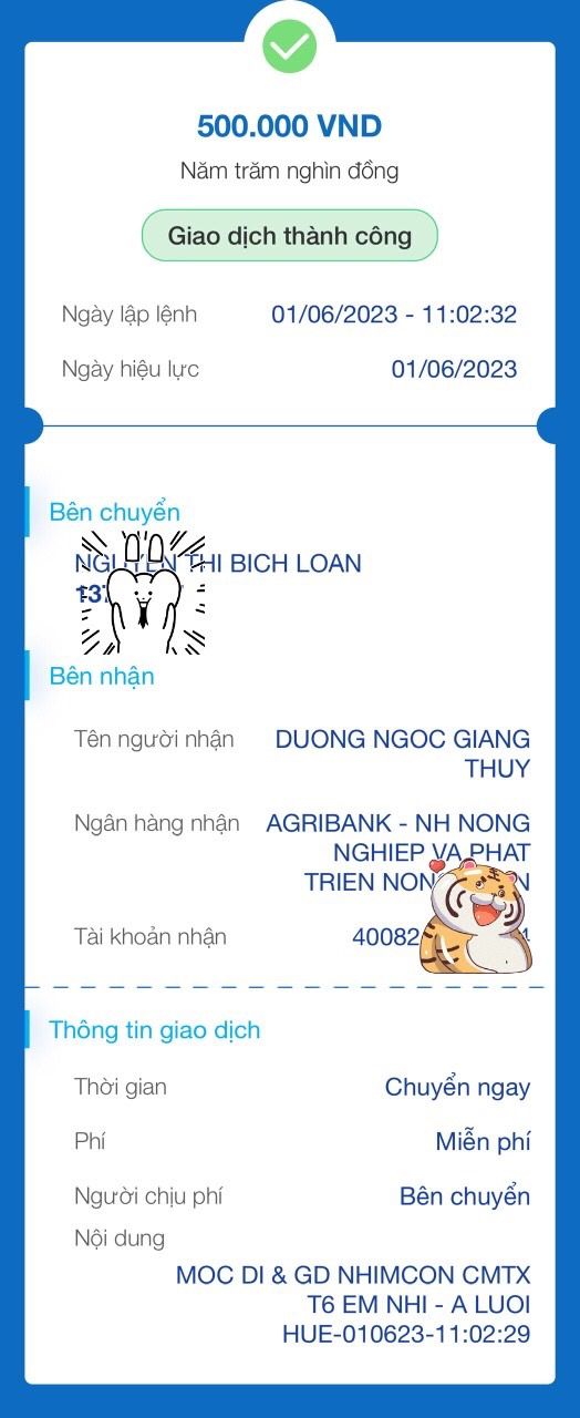 Loannguyen chuyển 500,000đ tiền CMTX tháng 6 từ Mộc Di và Gd Nhimcon đến em Nhi qua TK Wendy Dương rồi ạ, nhờ bạn chuyển giúp nhé.