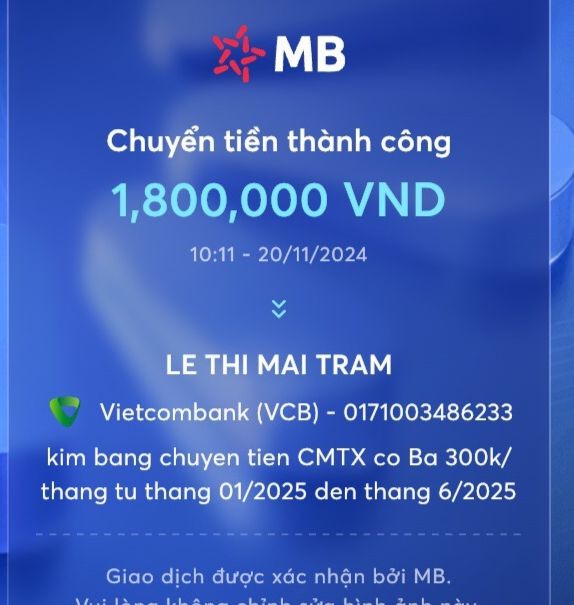 Mình xin CMTX tiếp đến cô Ba 300k/tháng, từ tháng 01/2025 đến tháng 6/2025, đã chuyển vào tk @maitramtg , nhờ em xác nhận và chuyển đến cô Ba dùm, cảm ơn em!