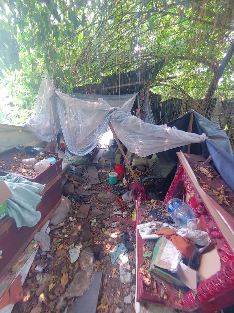 Vài tấm bạt đã cũ nát, được căng tạm, xiêu vẹo để che nắng chứ mưa thì chắc không chống đỡ được. Xung quanh thì cây cối mọc um tùm, quanh đó là những đồ phế thải người dân không dùng đến, vứt la liệt. Hai bà tuổi cao, sức yếu nên không thể nào dọn dẹp được.