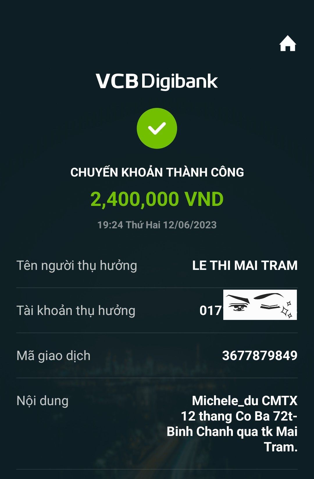 Lathuvang đã chuyển tk Mai Trâm CMTX 1 năm Cô Ba của Michele_du và GĐ (T6/23 đến T5/24). Nhờ Mai Trâm chuyển tiếp nhé. Cảm ơn em.