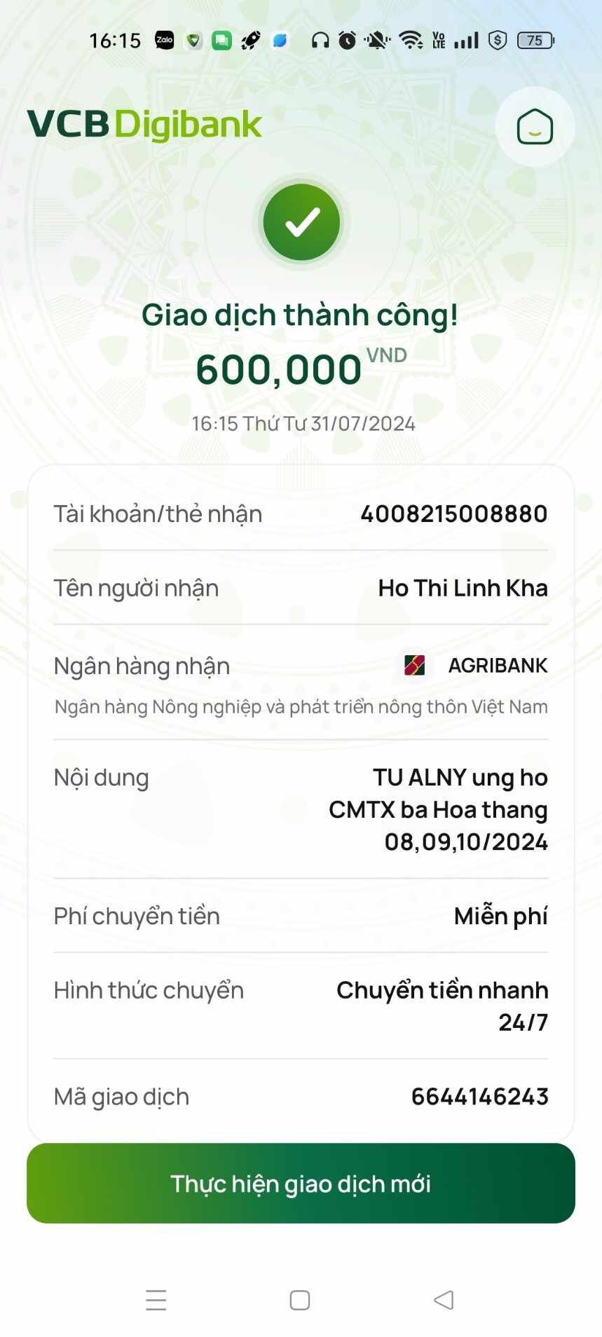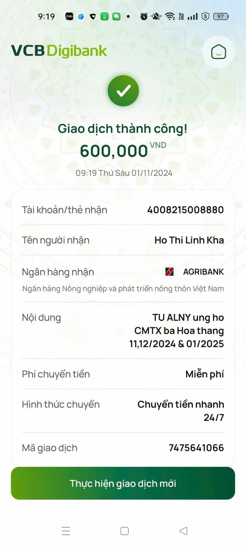 Gia đình gửi lời cảm ơn ạ! Hôm cô Kha đã nhận 900.000đ chia đều cho tháng 5,6,7 mỗi tháng 300.000đ