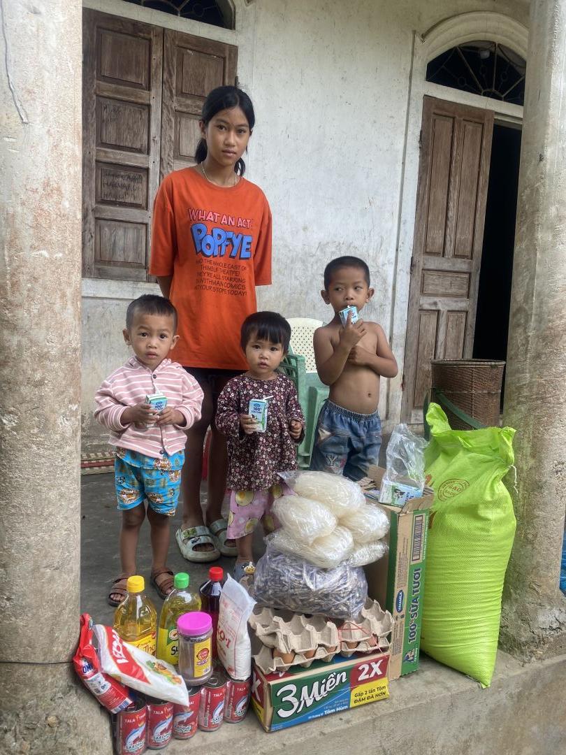 Em cô Kha đại diện cho quý MTQ trao quà tháng 11 cho gia đình chị Hoa và 3 cháu ngoại bị bỏ rơi chị đang nuôi, chị Hoa và các cháu ko biết nói gì hơn rất biết ơn quý MTQ đã nuôi chị cùng các cháu. Tháng này nhà chị hết gạo mắm muối nên chị nhờ em mua và chở luôn vì chị không có xe để đi ạ. Em xin cảm ơn