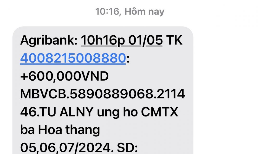 Hôm nay em có nhận chuyển khoản của quý anh chị giúp cho bà Hoa nuôi các cháu nhỏ. Biết ơn quý anh chị rất nhiều ạ