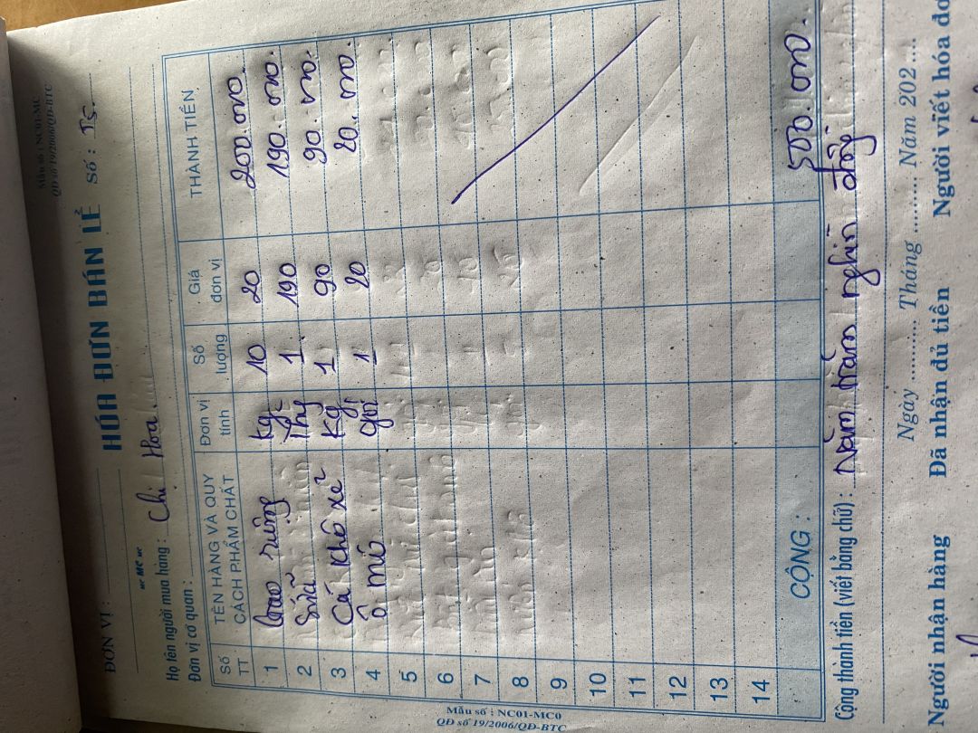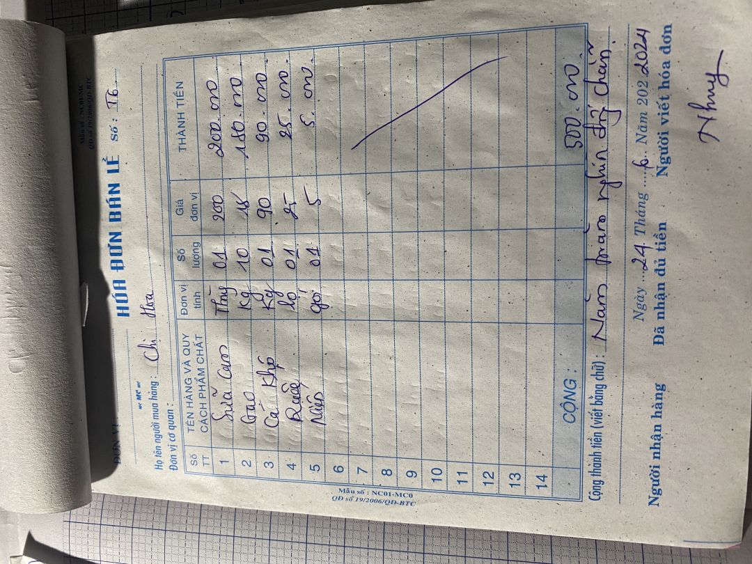 Em chào ngôi nhà NTCM hôm nay em đã mua nhu yếu phẩm tháng 7 cho gia đình bà Hoa và các con cháu mô côi, với số tiền là 500.000đ bao gồm