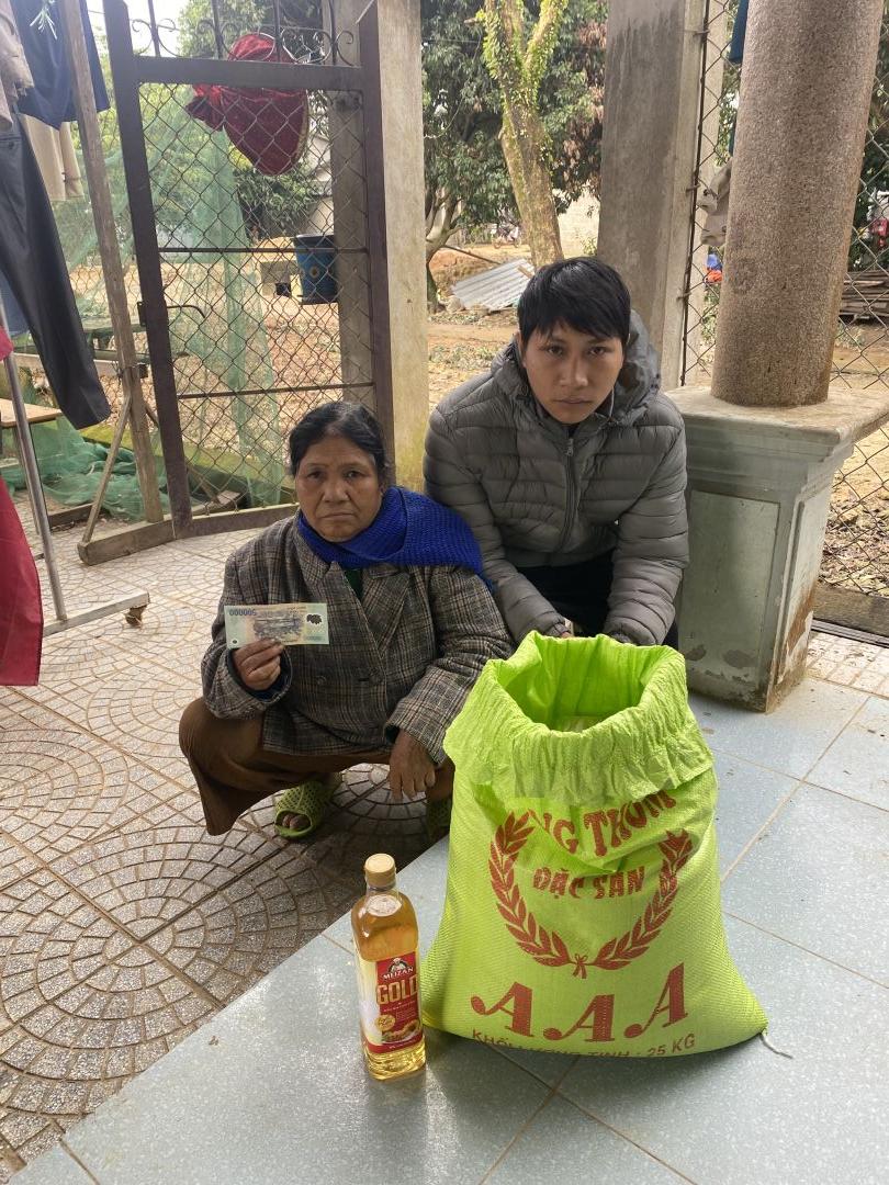Trao nhu yếu phẩm tháng 10 và 11 cho bà Kan Khoan trong tháng 12 này vì cả tháng mẹ con bà đi nằm bệnh viện Huế vừa mới về ạ, nên tháng này em mới trao ạ 25kg gạo ruộng và chai dầu ăn trị giá 500.000đ cùng với 500.000đ tiền mặt ạ. Gia đình biết ơn quý MTQ đã cưu mang gia đình nhiều