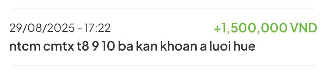 @trangvitgioi : Em xuất quỹ NTCM chuyển tới @Hồ Thị Link Kha 1,500,000₫ tiền CMTX bác Kăn Khoan trong thời gian 3 tháng kể từ tháng 8/2025.