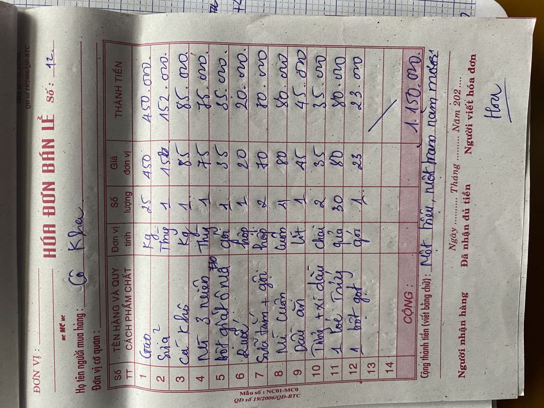Hôm nay em thay mặt quý mtq giúp đỡ bà Kan Khoan mua nhu yếu phẩm tháng 12 ạ. Trong cái giá rét của vùng núi phía Tây của Thừa Thiên Huế bà đã nhờ em mua gạo và thực phẩm hết với số tiền 1.150.000đ Bà biết ơn quý MTQ rất nhiều