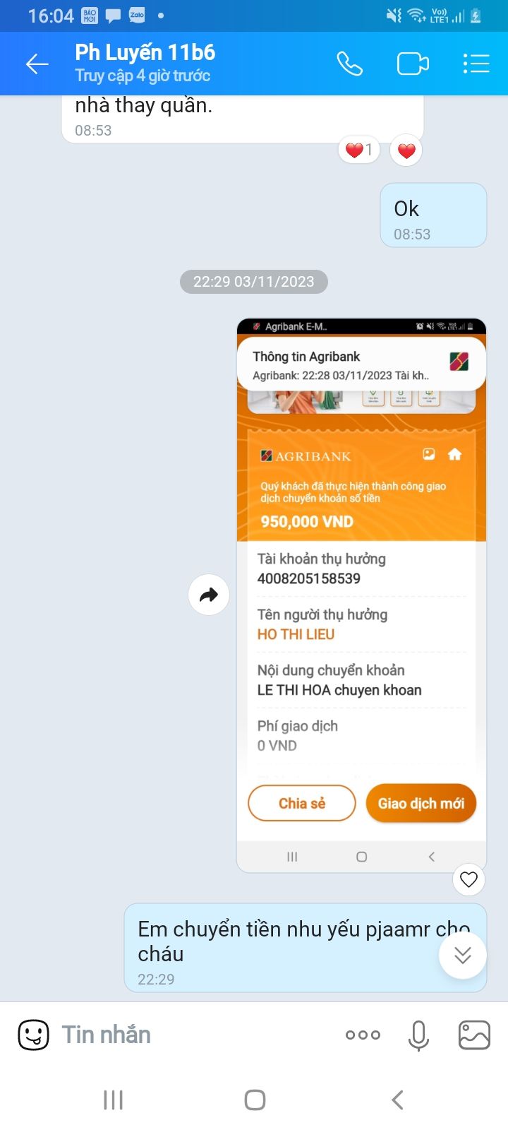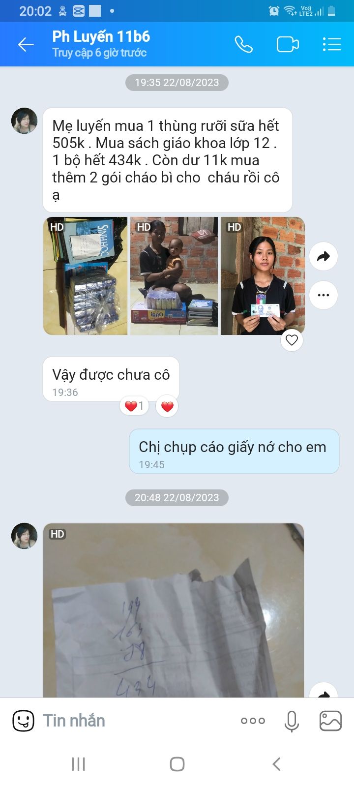 Hôm qia em đã chuyển  số tiền   nhu yếu phẩm 950 k của em Minh  Ngọc cho em Luyến tháng 08 và 500k CMTX  tháng 08 cho mẹ em Luyến . Để gđ mua nhu sách vở cho em Luyến và sữa cho cháu phi. Cảm ơm tc của quí anh chị rất nhiều ạ