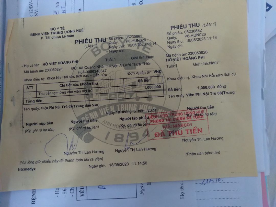 Dạ hiện tại cháu đang điều trị tại Bv TW Huế, vì hoàn cảnh khó khăn nên gđ mới tạm ứng viện phí cho cháu được 1 triệu ạ. Xin cảm ơn tấm lòng của quí mạnh thường quân giành cho cháu cũng như gđ ạ. Rất mong quí mạnh thường quân ủng hộ CMKTX cho cháu 1 triệu  để chi phí tiền viện phí trong lúc khó khăn này ạ. Trân trọng !
