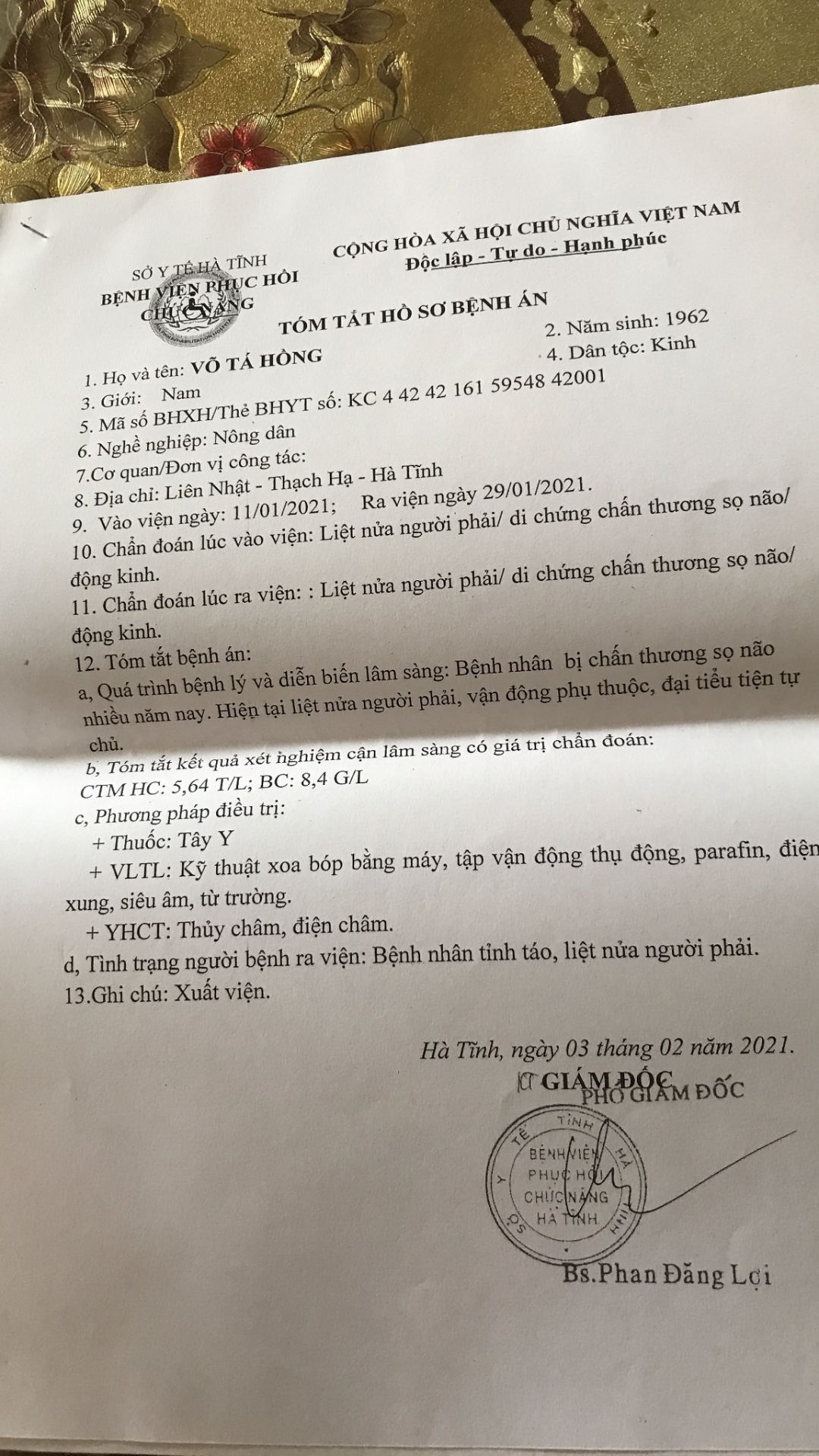 - Sưc khoẻ anh Hồng giảm trầm trọng, giờ không còn ngồi dậy đc nữa, ăn uống, tiểu, tiện không tự chủ được,mọi người đến anh cũng không nhận ra kể cả chị Minh vợ anh