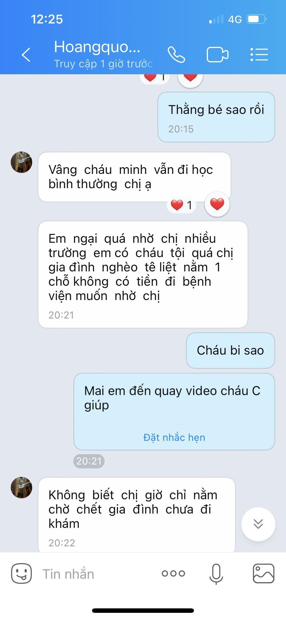 Các mẹ cùng phòng cũng có hỗ trợ cháu trong vệ sinh, tắm rửa. Cháu mong về nhà lắm, nhớ núi , nhớ rừng , nhớ thầy cô và bạn bè nhưng bệnh muộn quá k thể chữa ngày 1, ngày 2 được. Bệnh mãn tính rồi. Mai tân cũng đã giải thích và động viên cho bố con cháu. Hiện mai tân vẫn nhờ viện đặt cơm cho bố con cháu ba bữa.