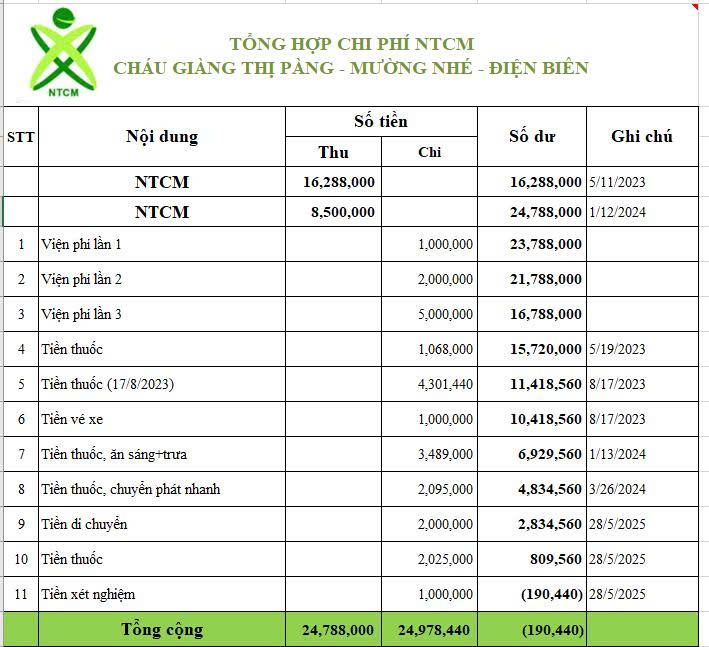 Cháu vẫn nhận thuốc và khám bệnh tại Mường Nhé và BHYT thanh toán hoàn toàn nên thời gian qua chưa sử dụng tới tiền cưu mang của NTCM. Maitan sẽ liên hệ lại xem tình hình của cháu thế nào?