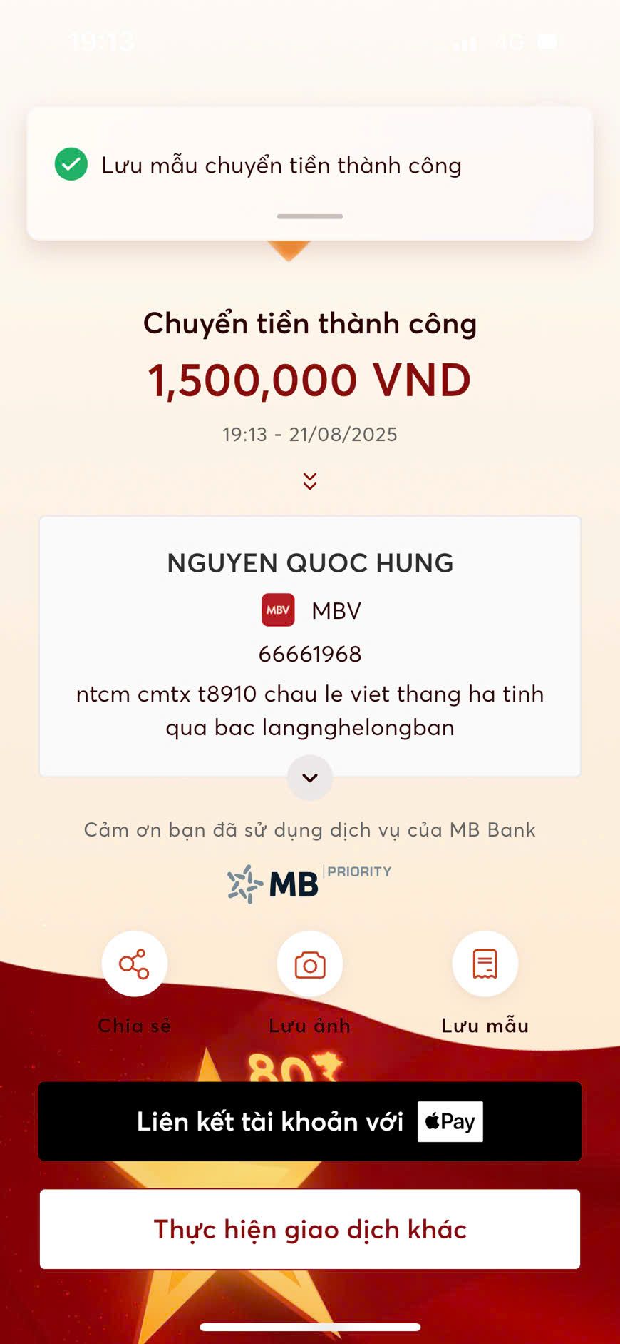 @trangvitgioi : Em xuất quỹ NTCM chuyển tới bác Lắng nghe lòng bạn 1,500,000₫ tiền CMTX em Thắng trong 3 tháng kể từ tháng 8/2025 dùm nhé.