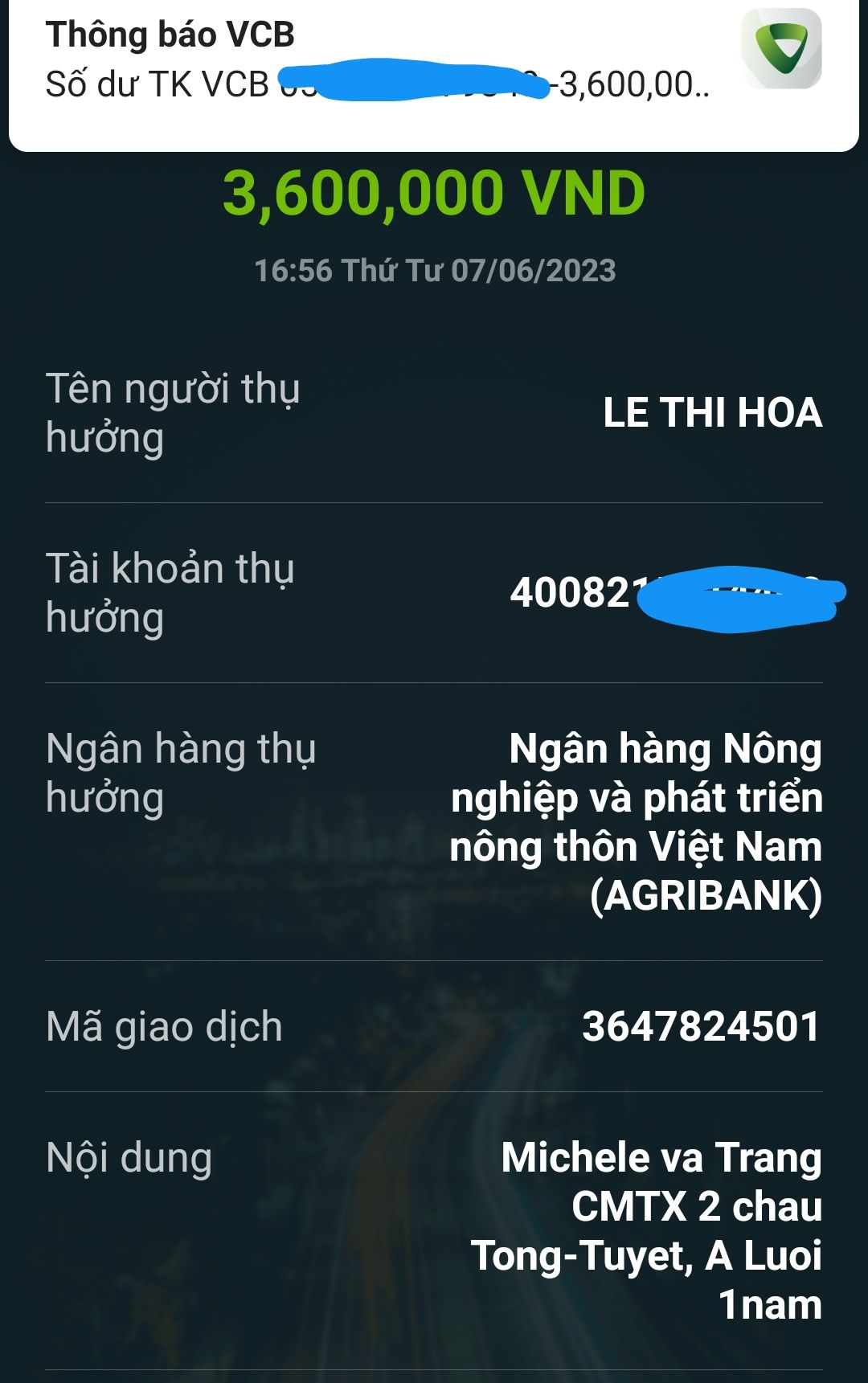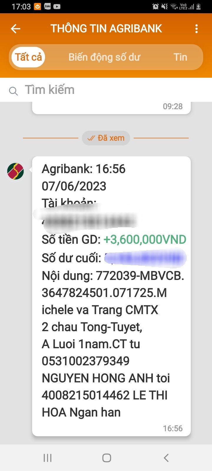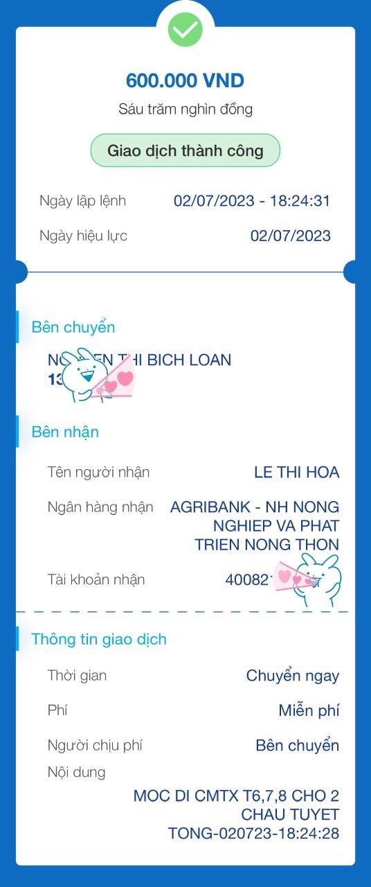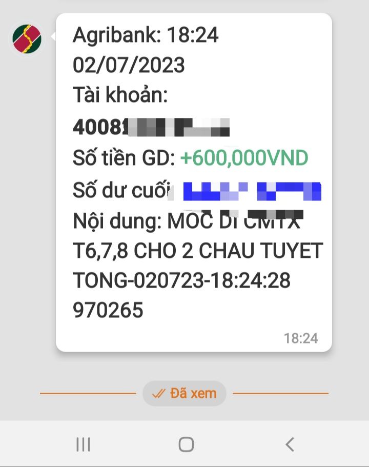Trích dẫn của: loanngyen1202 vào 30-05-2023 14:09:23Chào cả nhà,Bạn Mộc Di xin được hỗ trợ gia đình 200,000đ/ tháng từ tháng 6 tạm thời đến hết năm 2023 nhé.Cảm ơn bạn Mộc Di và cả nhà.Thân !CMTX tháng 6 chuyển cho Wendy Dương luôn phải ko ạ? Xin cảm ơn !