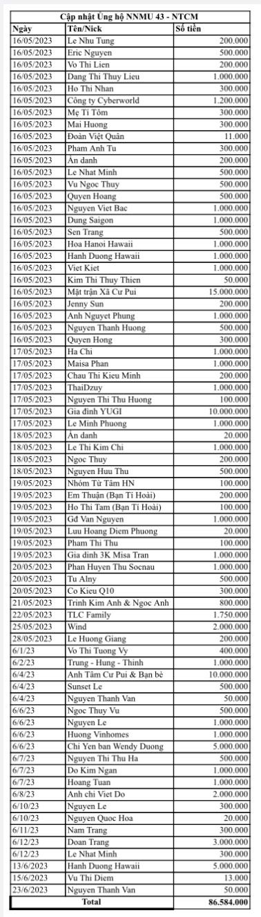 Cập nhật số tiền ủng hộ NNMU43 đến thời điểm hiện tại.