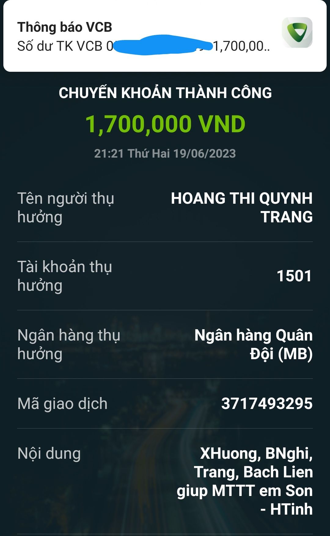 Mọi ủng hộ xin gửi về tk NTCM- 1501 Hoàng Thị Quỳnh Trang