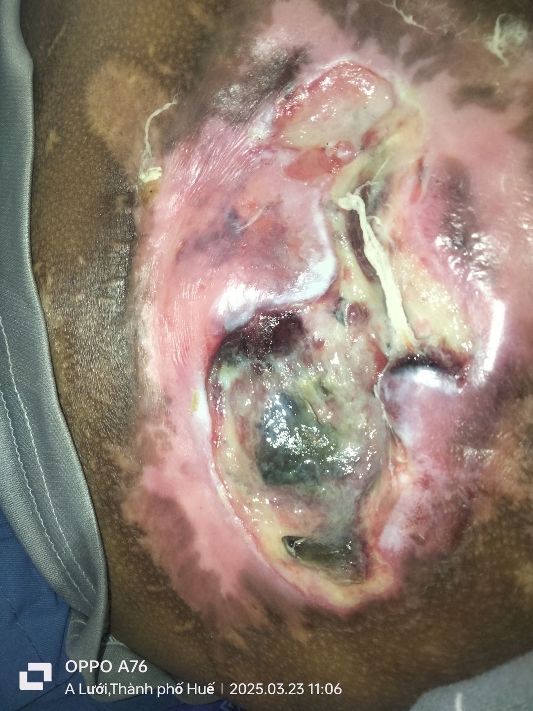 Em A Viết Phương hiện tại đang bị hoại tử cả 4 chỗ, 2 bên đùi và ngay cả đầu gối và vết thương chỗ cung cụt bị tái phát vết thương và em gh đang là khó khăn ngủ nằm rất là khó.