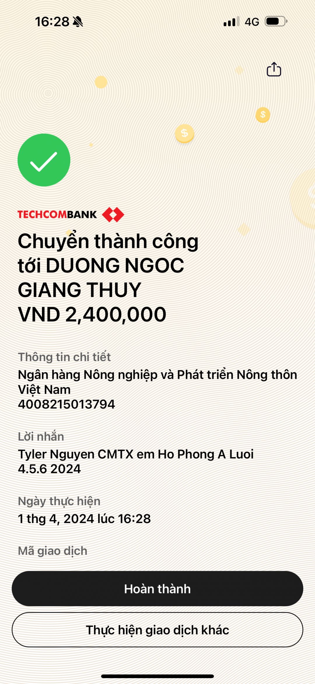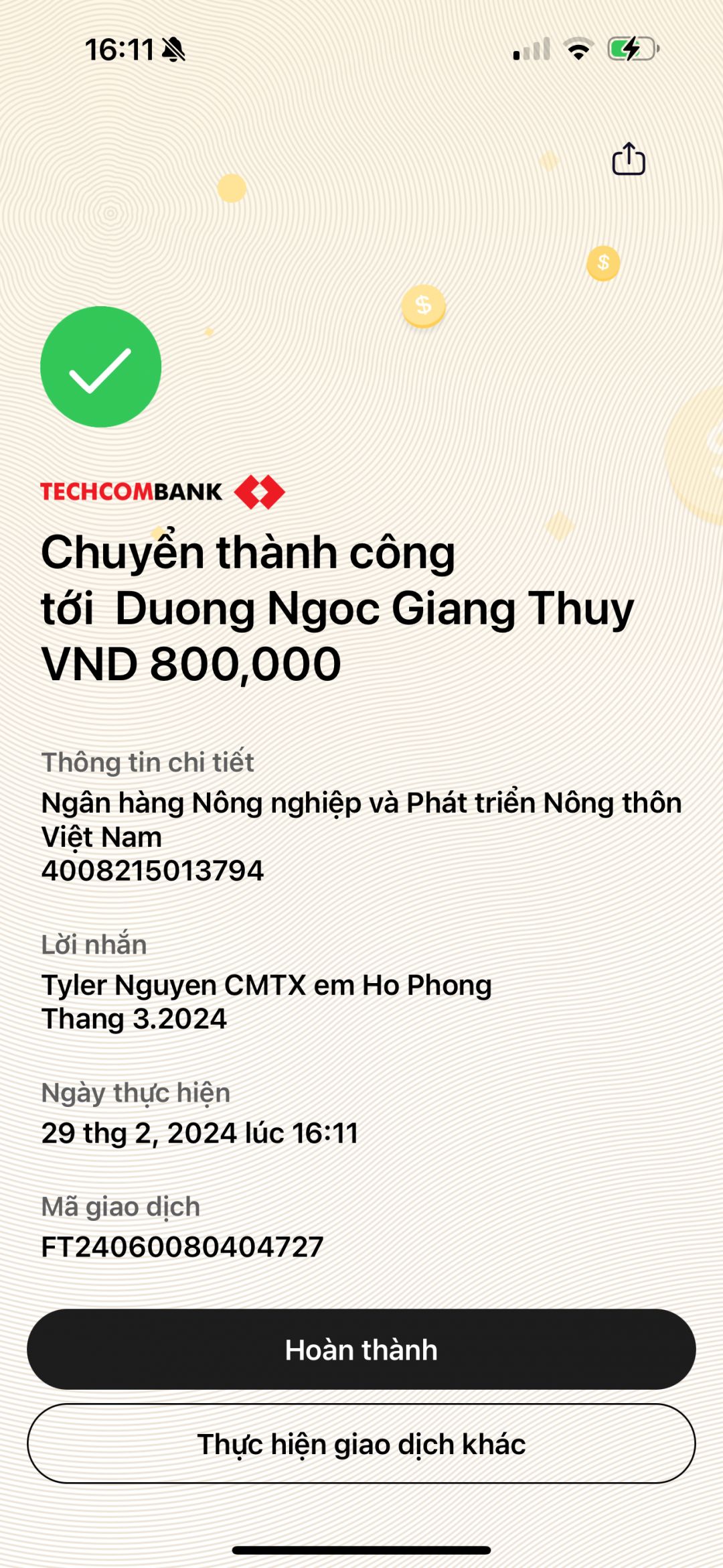Tyler Nguyen đã chuyển tiền CMTX Tháng 3.2024 cho em Phong qua tài khoản Wendy Duong.