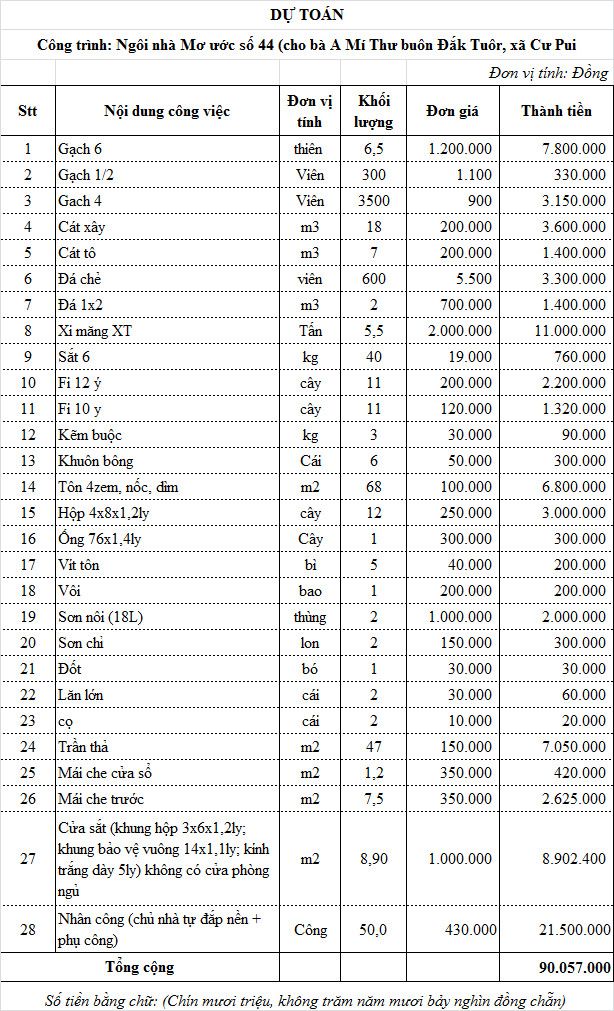 Bảng dự trù kinh phí NNMU số 44 cho gia đình bà H Nắp Byă là 90.057.000