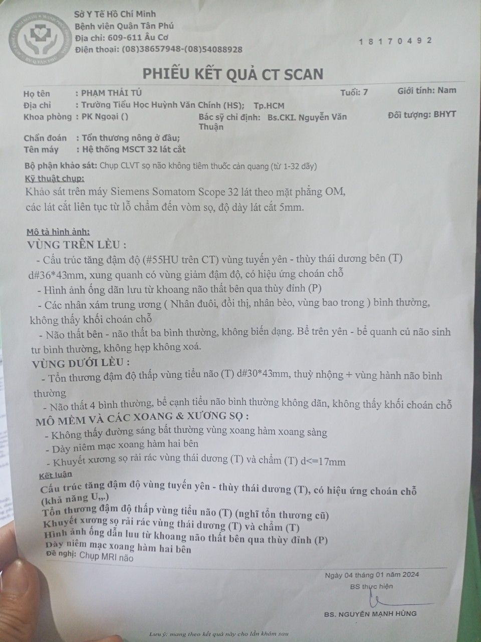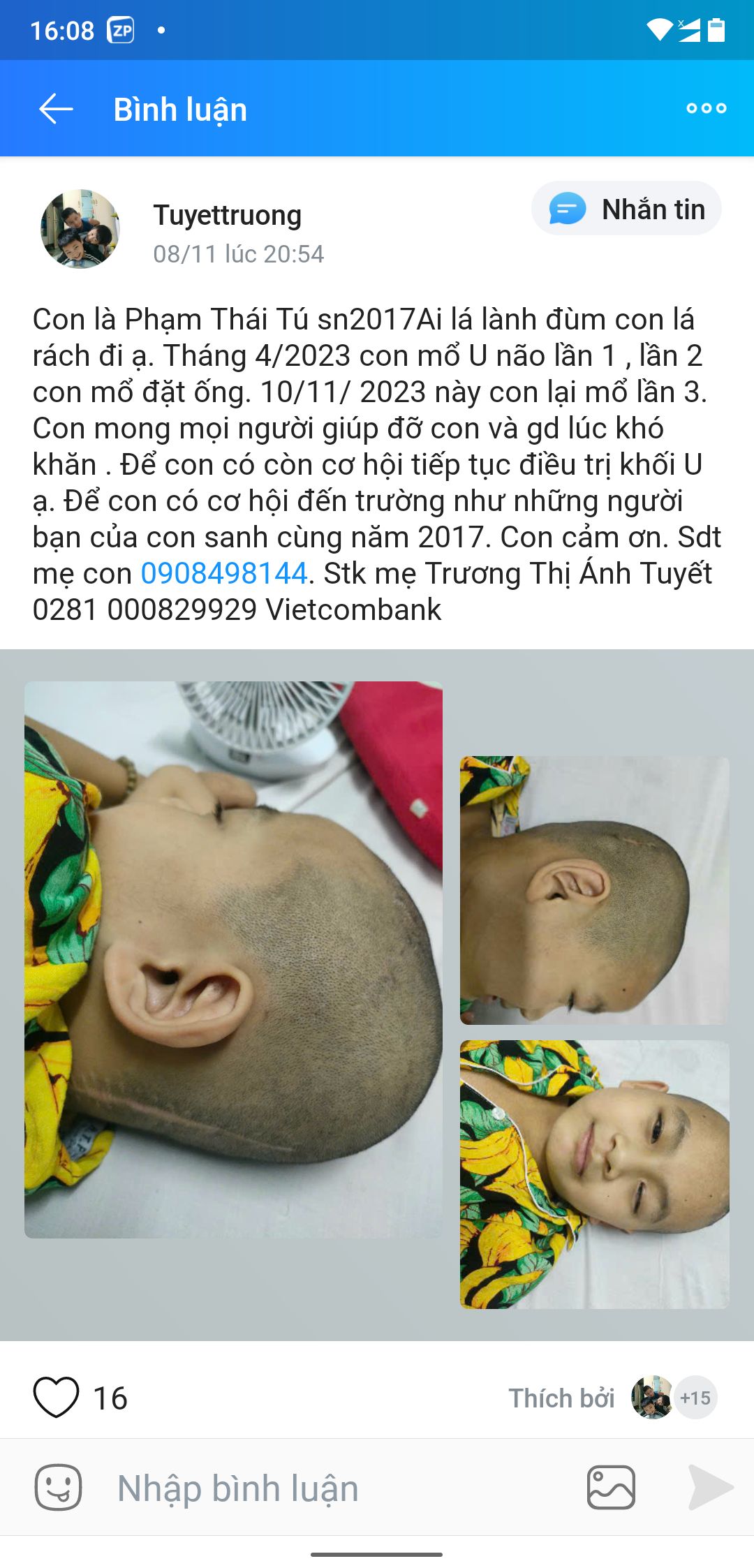 Mình muốn giới thiệu một trường hợp cần xác minh để có hướng giúp đỡ tốt hơn. Bé là Phạm Thái Tú, học cùng lớp 1 với con mình, nhưng từ khai giảng tới giờ vẫn chưa tới lớp được vì phải điều trị u não lành tính, vừa mổ xong lần 3. Theo lời cô giáo thì cha bé làm thợ sơn, mẹ làm giúp việc, công việc không ổn định nhưng vẫn phải nuôi 3 anh em cũng đang học lớp 4 và 5 tại cùng trường Huỳnh Văn Chính.