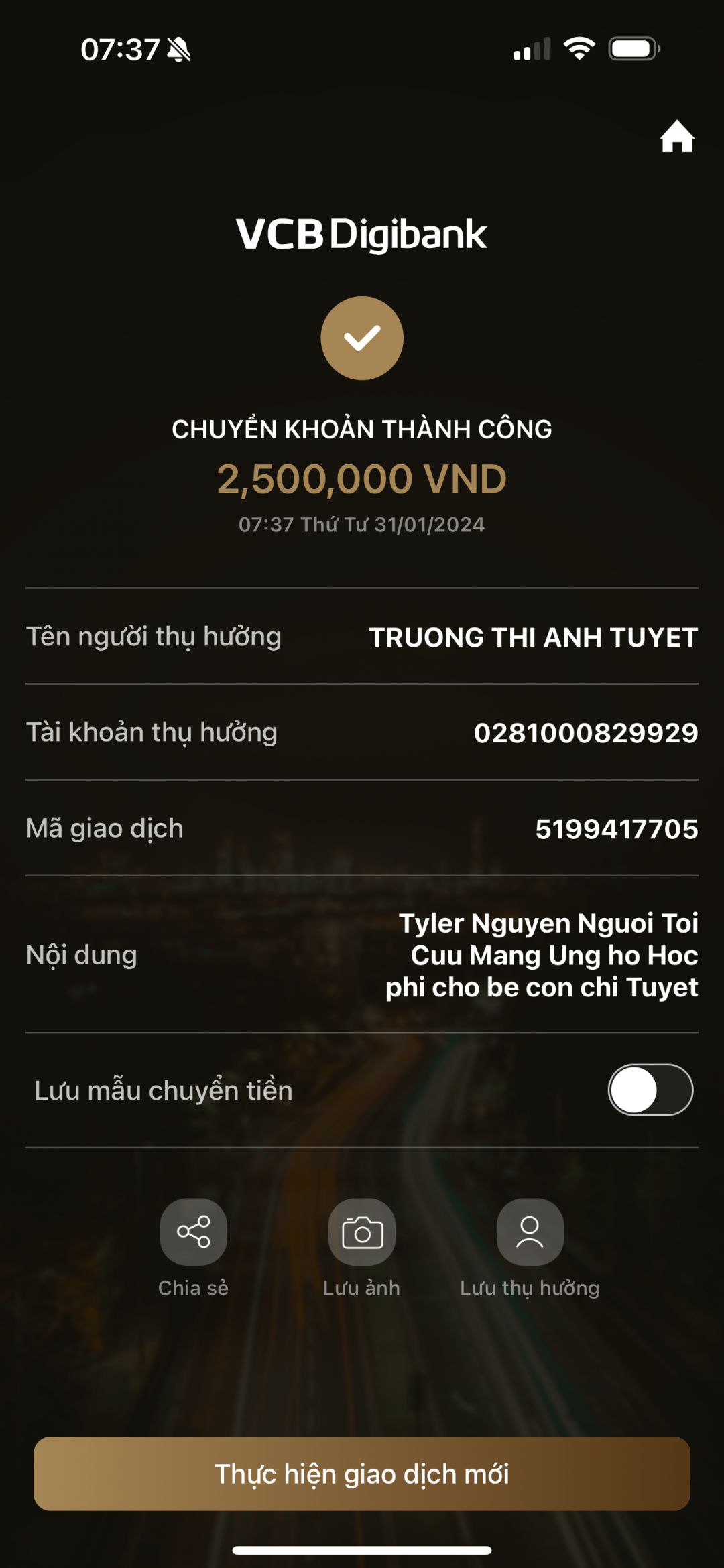 Hoàn cảnh này, bạn Tyler Nguyen CMKTX số tiền 2,500,000 VND để gia đình chị Tuyết lo học phí cho bé nhỏ con anh chị!