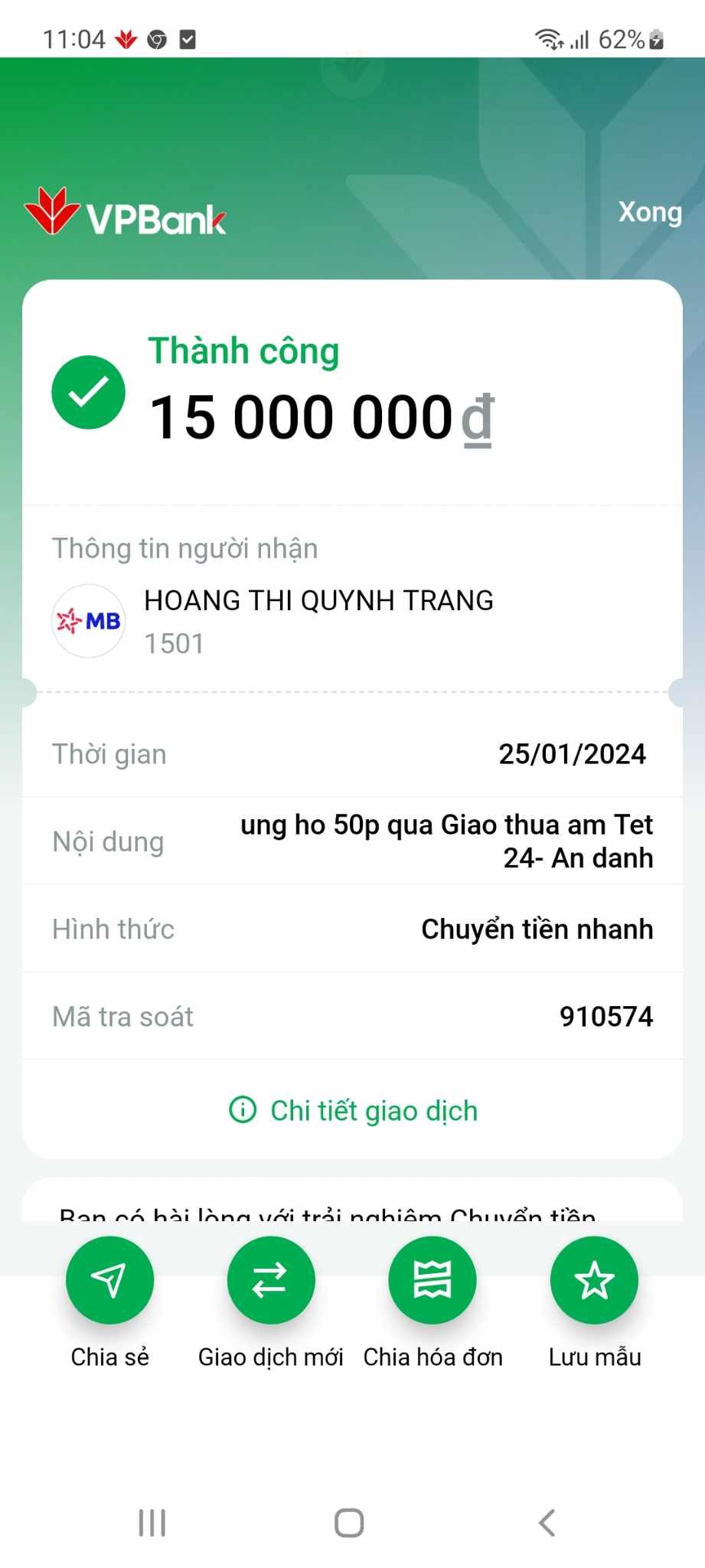 Letuantu đã chuyển tiền vào tài khoản thủ quỹ.