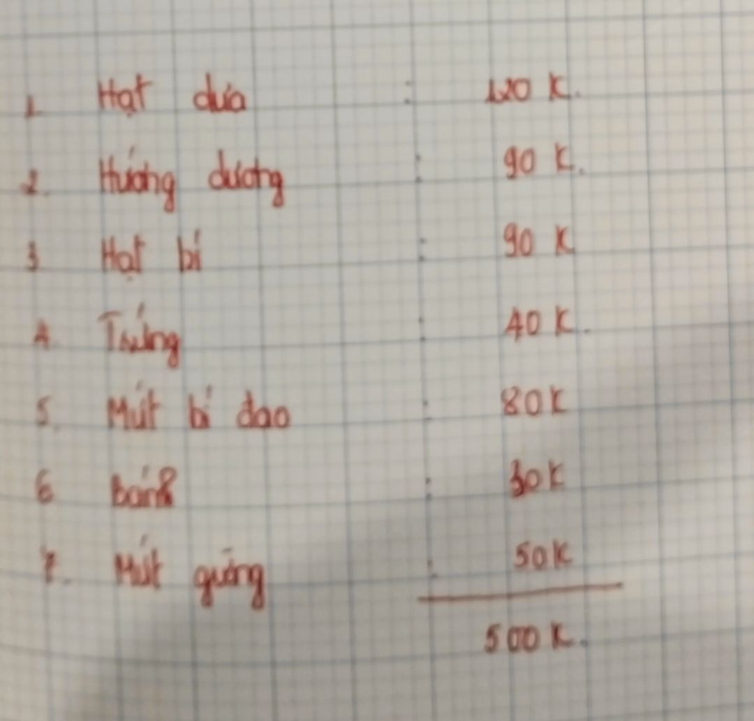 Gạo 500.000 đ, mì khô 350.000 đ, cá cơm sữa khô 200.000 đ, trứng 100.000 đ, khuyết khô 50.000 đ
