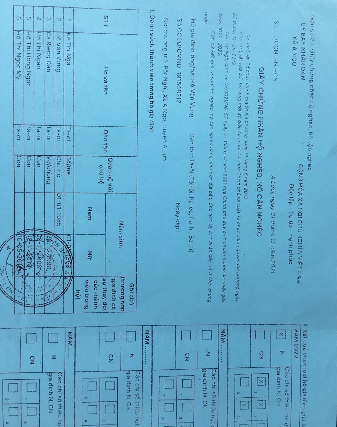 Con trai của chị tên là Hồ Văn Vưng sinh năm 1985 năm nay 39 tuổi và vợ tên là Ka Rieng Đàn. Vợ chồng anh Hồ Văn Vưng có 3 đứa con gái hiện đang học cấp 1, cấp 2 và cấp 3 là cháu lớn nhất.