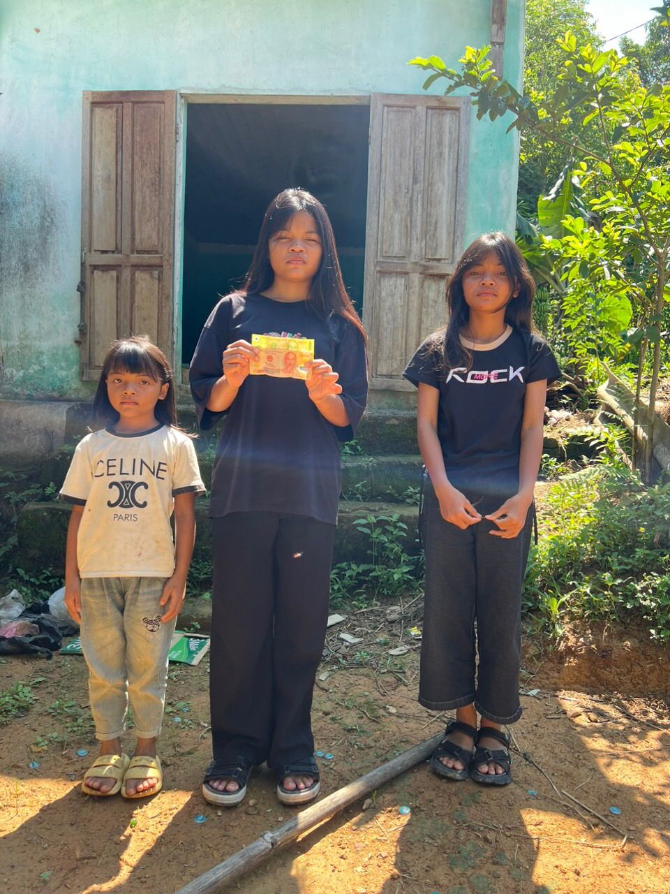 Em Pi Riu Thế đã trao số tiền 200.000 đồng của chị Trang và chị Bạch Liên cho 3 cháu của bà Kê Thị Nga tháng 5/2024.