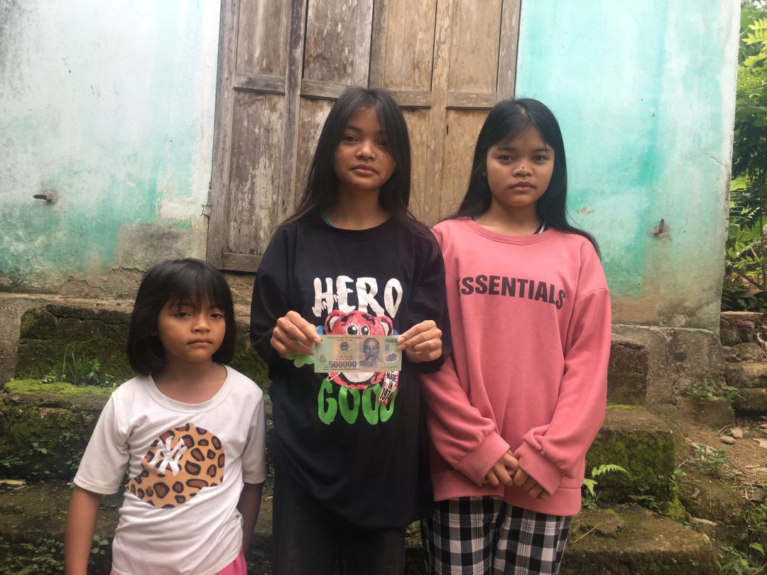 Em Pi Riu Thế đã trao số tiền 200.000 đồng của chị Trang và chị Bạch Liên cho 3 cháu của bà Kê Thị Nga tháng 5/2024.