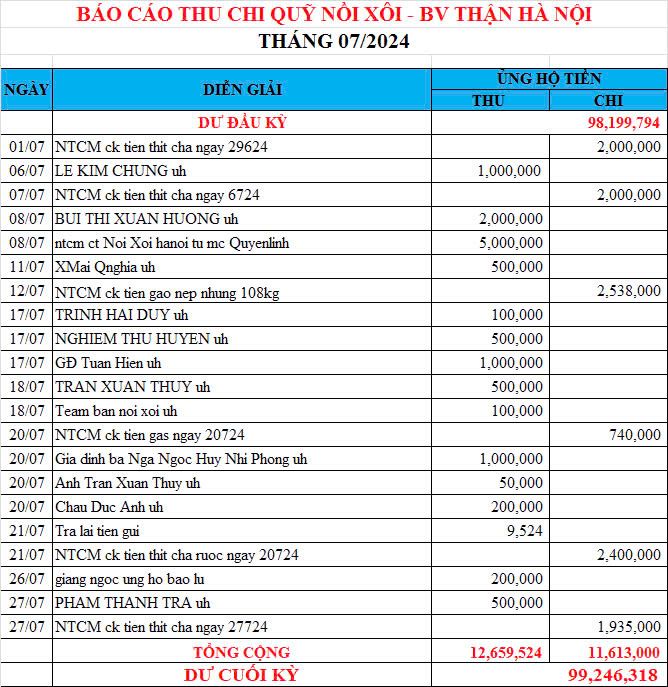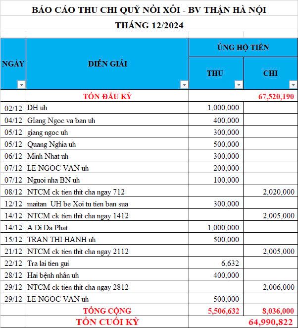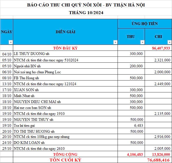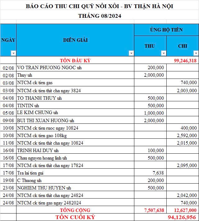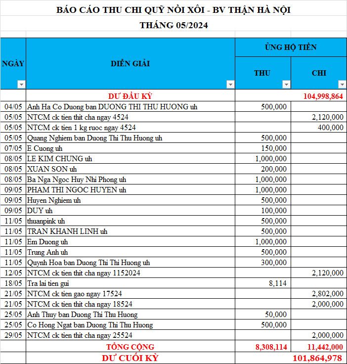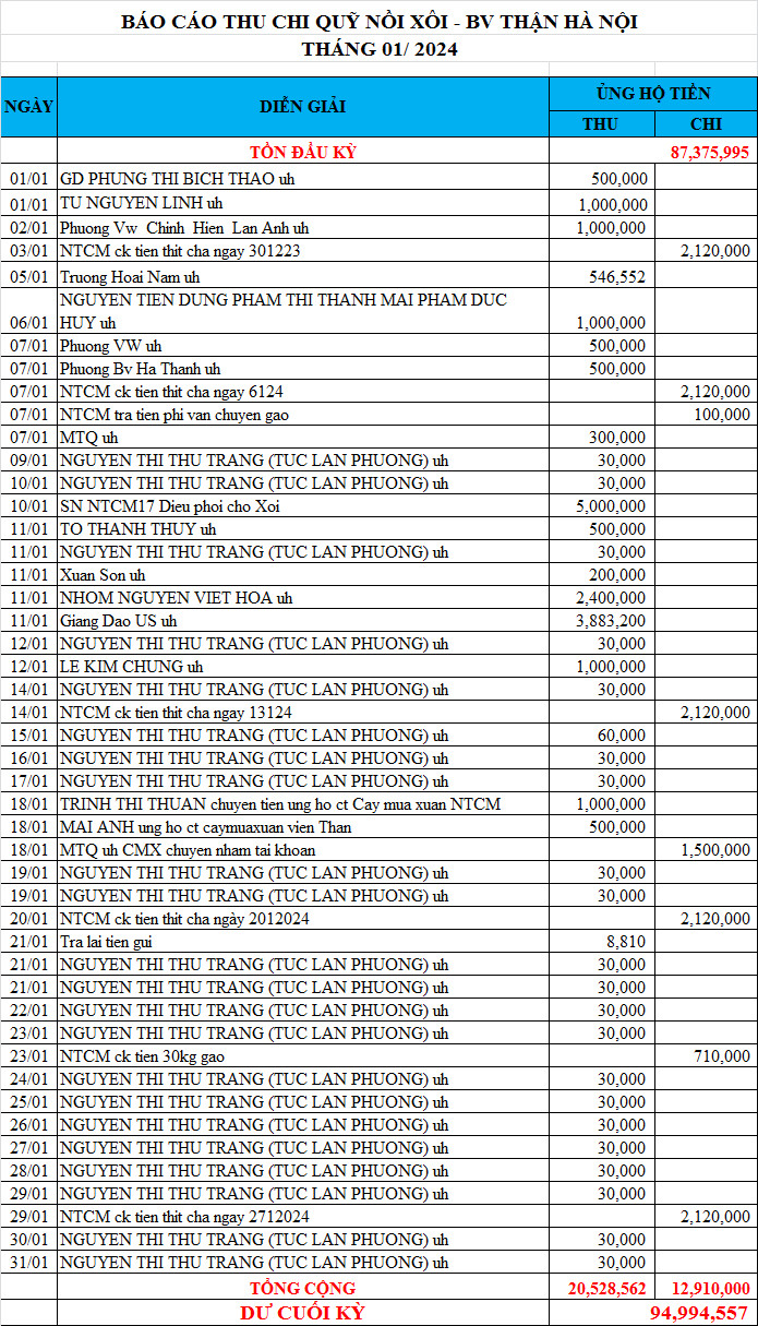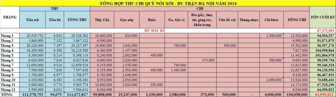 Re: Nồi Xôi - Bệnh viện Thận Hà Nội - Thống kê cưu mang, Báo cáo thu chi năm 2024