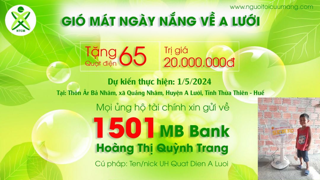 Lời đầu tiên em xin chân thành cảm ơn các quý mạnh thường quân đã hỗ trợ kính phí mua quạt kịp thời cho bà con của thôn Âr Bả Nhâm, huyện a lưới, tỉnh thừa Thiên-Huế. Em xin tạm ứng số tiền 18. 900.000 nghìn đồng. Kính nhờ quý anh chị ck cho thủ quỹ là cô LINH KHA STK: 4008215008880.