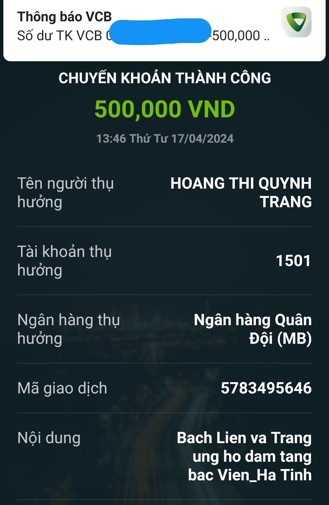 Mọi ủng hộ xin gửi về tk NTCM 1501. Hoang Thi Quynh Trang