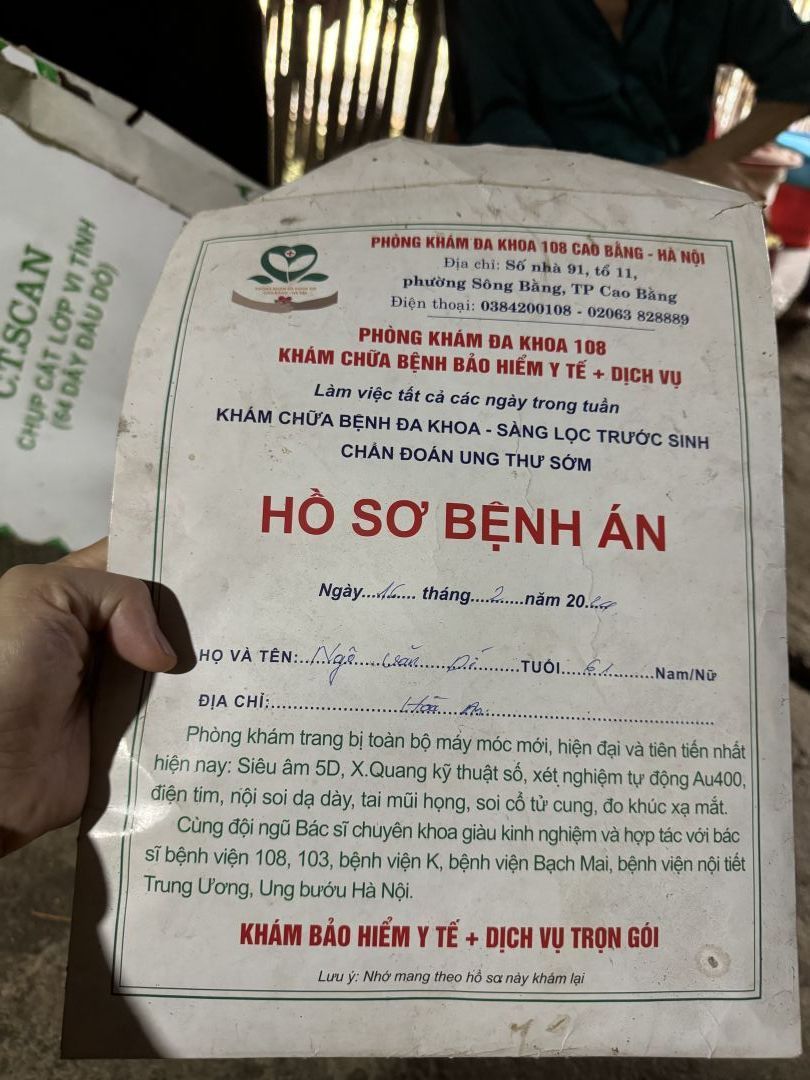 Chú Dí được chẩn đoán là U ác tính thực quản, viêm dạ dày hành tá tràng và được bệnh viện trả về do không có điều kiện theo phác đồ điều trị đắt tiền. Trước đây gia đình có nuôi trâu bò lợn nhưng đều phải bán hết để chữa bệnh cho chú. Cũng may nhà còn trồng lúa và nuôi gà được nên ít nhất trong nhà hiện vẫn có gạo ăn. Cám cảnh nhất là ngôi nhà, thực ra là túp lều rộng với các phên nứa trống toác, mưa gió tạt và đổ bất cứ khi nào. Chỗ ngủ của các thành viên gia đình thật khó hình dung ra nổi, tạm bợ và luộm thuộm bên hông nhà hoặc dưới mái hiên nhà.