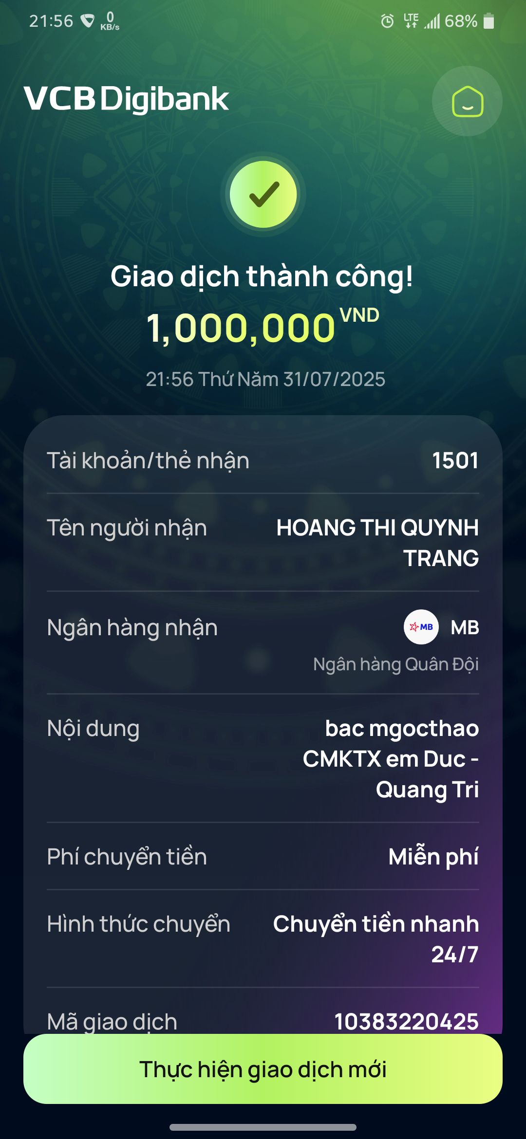 @trangvitgioi : Em xuất quỹ NTCM chuyển 1,500,000₫ tiền CMTX em Đức các tháng 3, 4 & 5/2025 về tài khoản cá nhân của Đức dùm nhé.