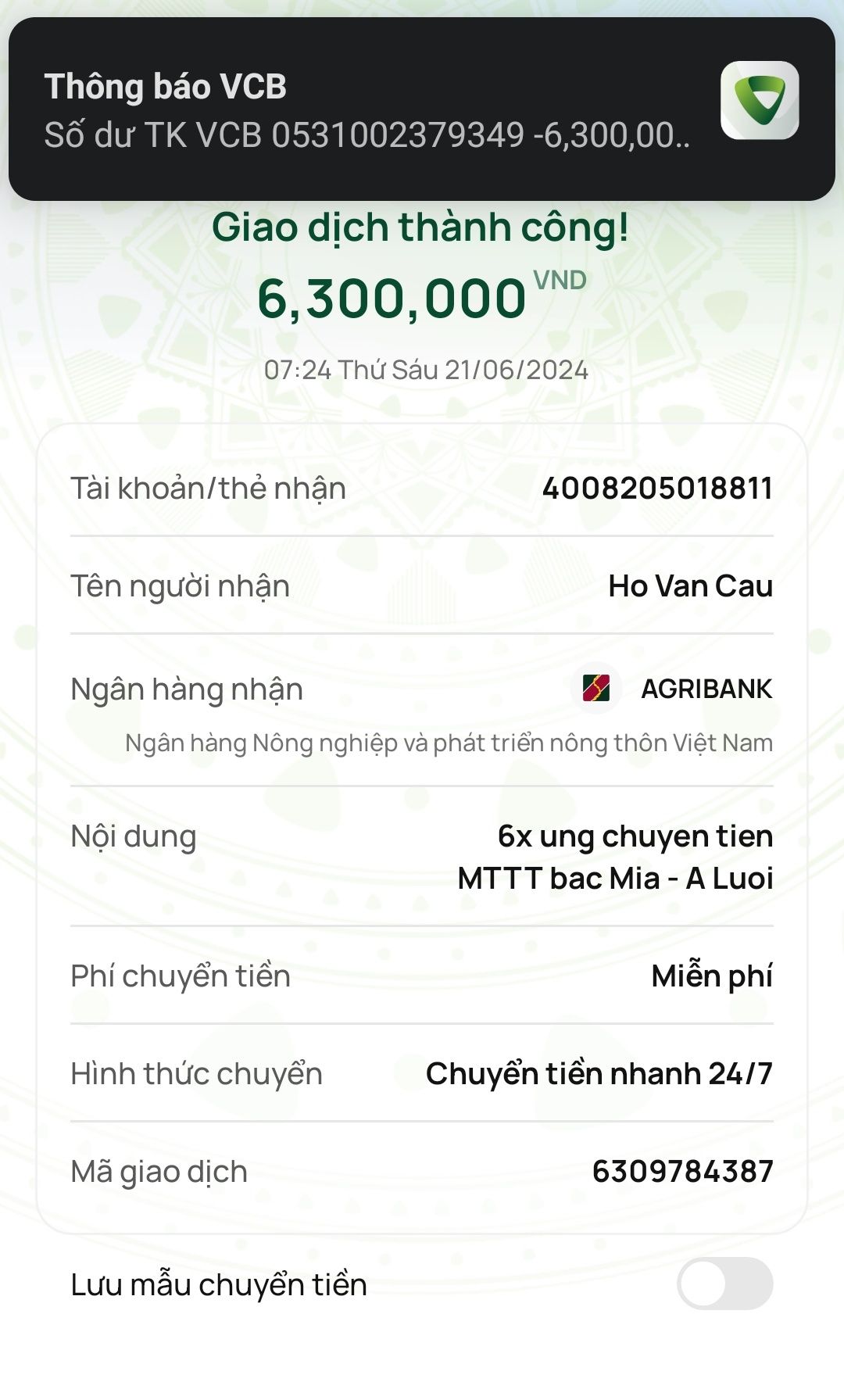 Em Pi Riu Thế đã nhận được chuyển khoản 6.300.000đ sáng sớm nay, ngày 21/06/2024 từ anh @banbe6x và 07h39 phút em đã ghé thắp hương cho ông Mía 60 tuổi ở A Lưới luôn.