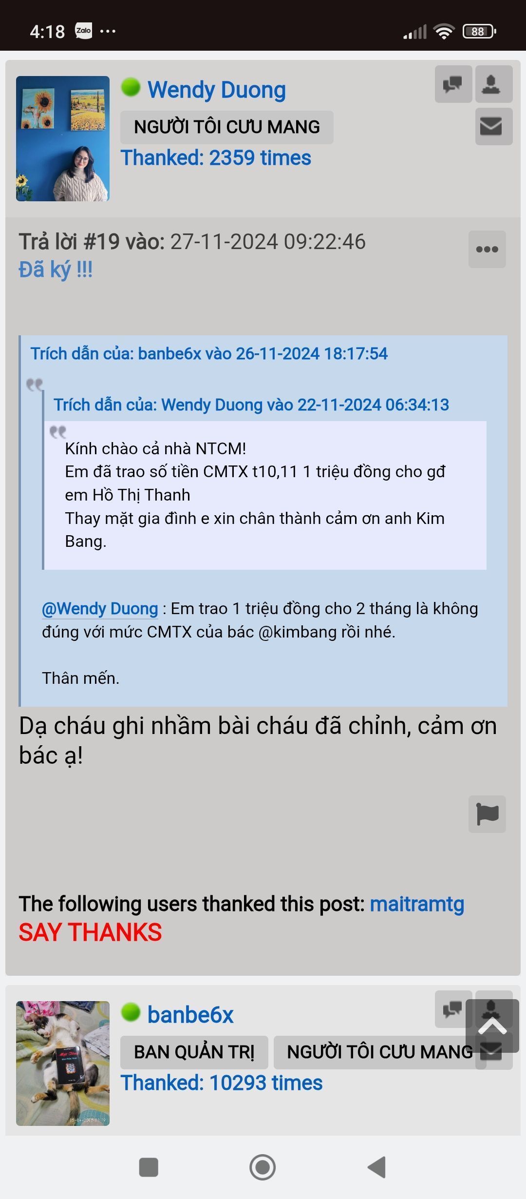 Em đã trao số tiền CMTX t10,11 1 triệu đồng cho gđ em Hồ Thị Thanh